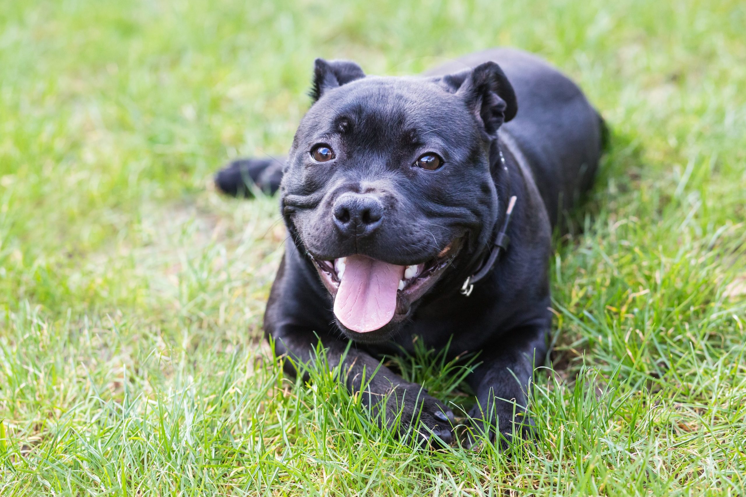 Staffordshire bull terrier dog lying down outisde
